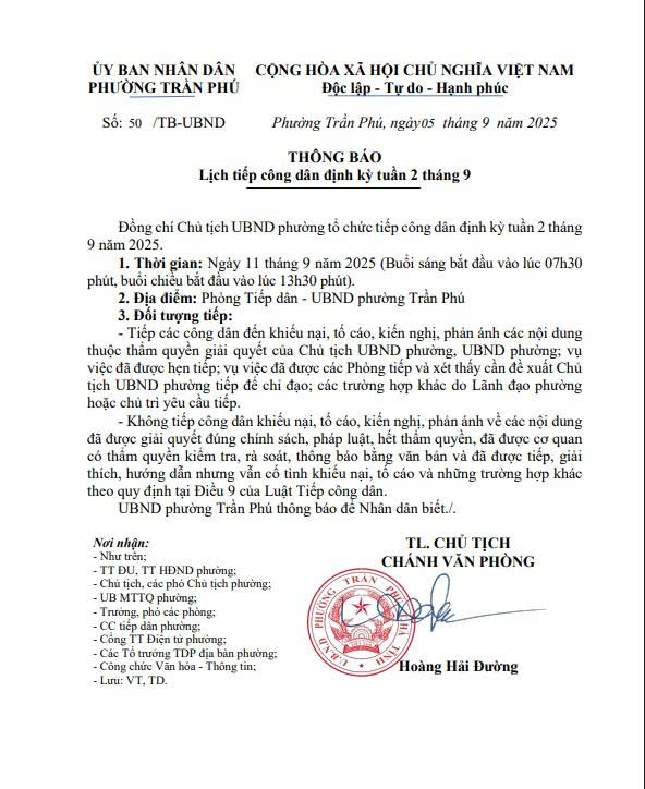 Lịch tiếp công dân định kỳ tuần 02 tháng 9 của Chủ tịch UBND phường Trần Phú vào ngày 11/9/2025 (thứ 5)