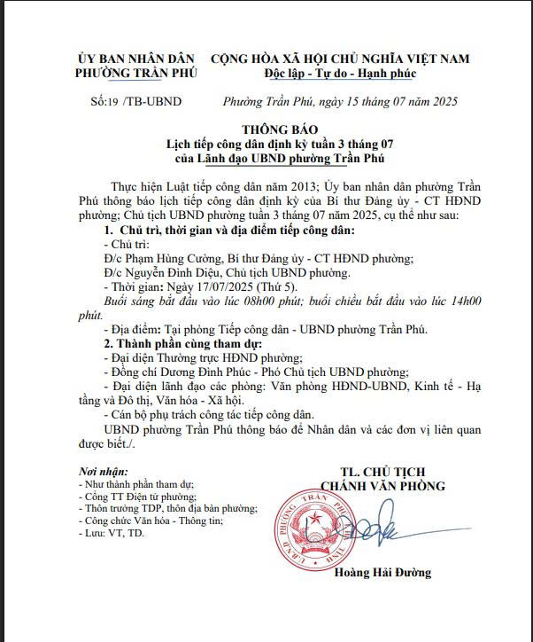 Lịch tiếp công dân định kỳ tuần 3 tháng 7 năm 2025 của Lãnh đạo UBND phường Trần Phú vào ngày 17/7/2025 (thứ 5)