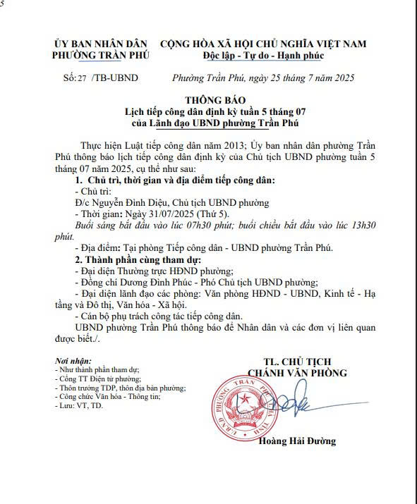 Thông báo lịch tiếp công dân định kỳ tuần 5 tháng 7 năm 2025 của Lãnh đạo UBND phường Trần Phú