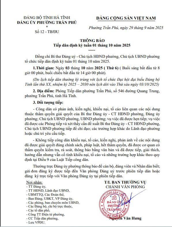 Thông báo tiếp công dân định kỳ tuần 1 tháng 10 của Bí thư Đảng ủy - Chủ tịch HĐND, Chủ tịch UBND phường Trần Phú