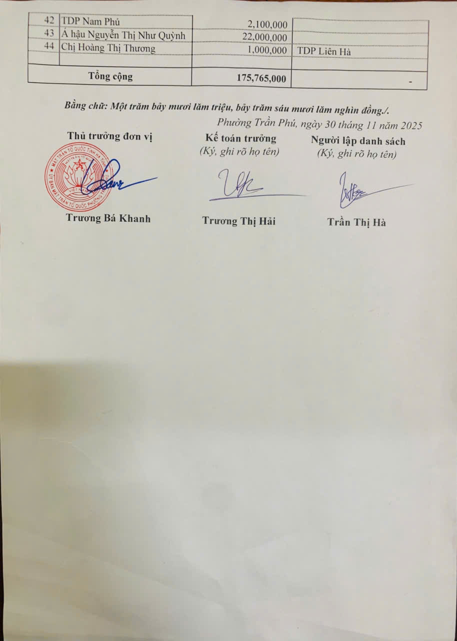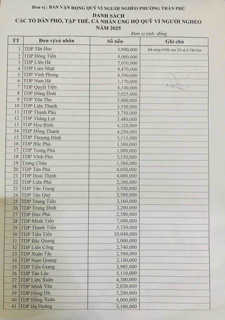 Kính thưa các cơ quan, đơn vị, doanh nghiệp, nhà hảo tâm và Nhân dân trên địa bàn phường Trần Phú, trong thời gian: Từ ngày 14/11/2025 đến ngày 30 /11/2025. Thông qua lời kêu gọi vận động ủng hộ Quỹ “Vì người nghèo” năm 2025 do Ủy ban MTTQ Việt Nam phường Trần Phú phát động, với tin truyền thống tương thân tương ái, lá lành đùm lá rách, lá rách ít đùm lá rách nhiều,với nhiều hình thức ủng hộ; Ủng hộ trực tiếp tại trụ sở Ủy ban MTTQ Việt Nam phường Trần Phú; Ủng hộ qua chuyển khoản vào tài khoản Quỹ “Vì người nghèo” phường Trần Phú và Ủng hộ tại tại các trưởng ban công tác mặt trận 42 tổ dân phố, tại các cơ quan, đơn vị, trong thời gian vận động tính từ ngày 14/11/2025 đến ngày 30 /11/2025, tổng số tiền đã tiếp nhận: gồm có 42 tổ dân phố và các cơ quan, cá nhân mạnh thường quân là 175.765.000 đồng.