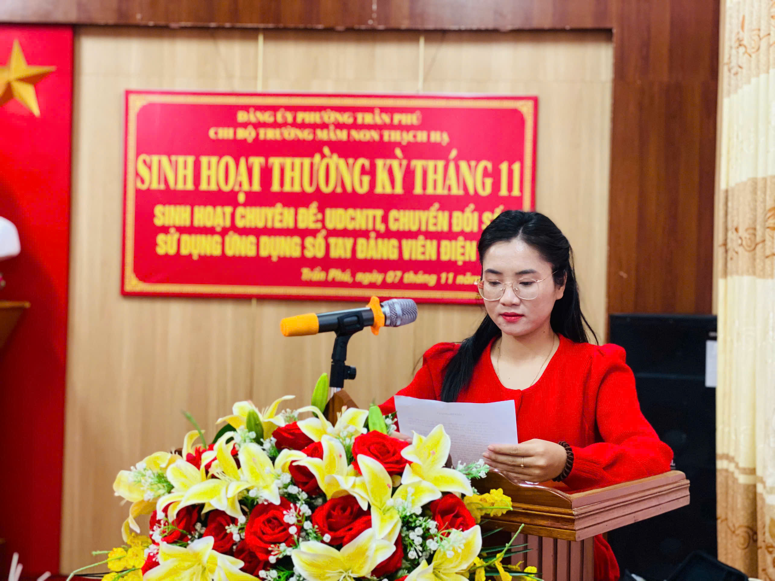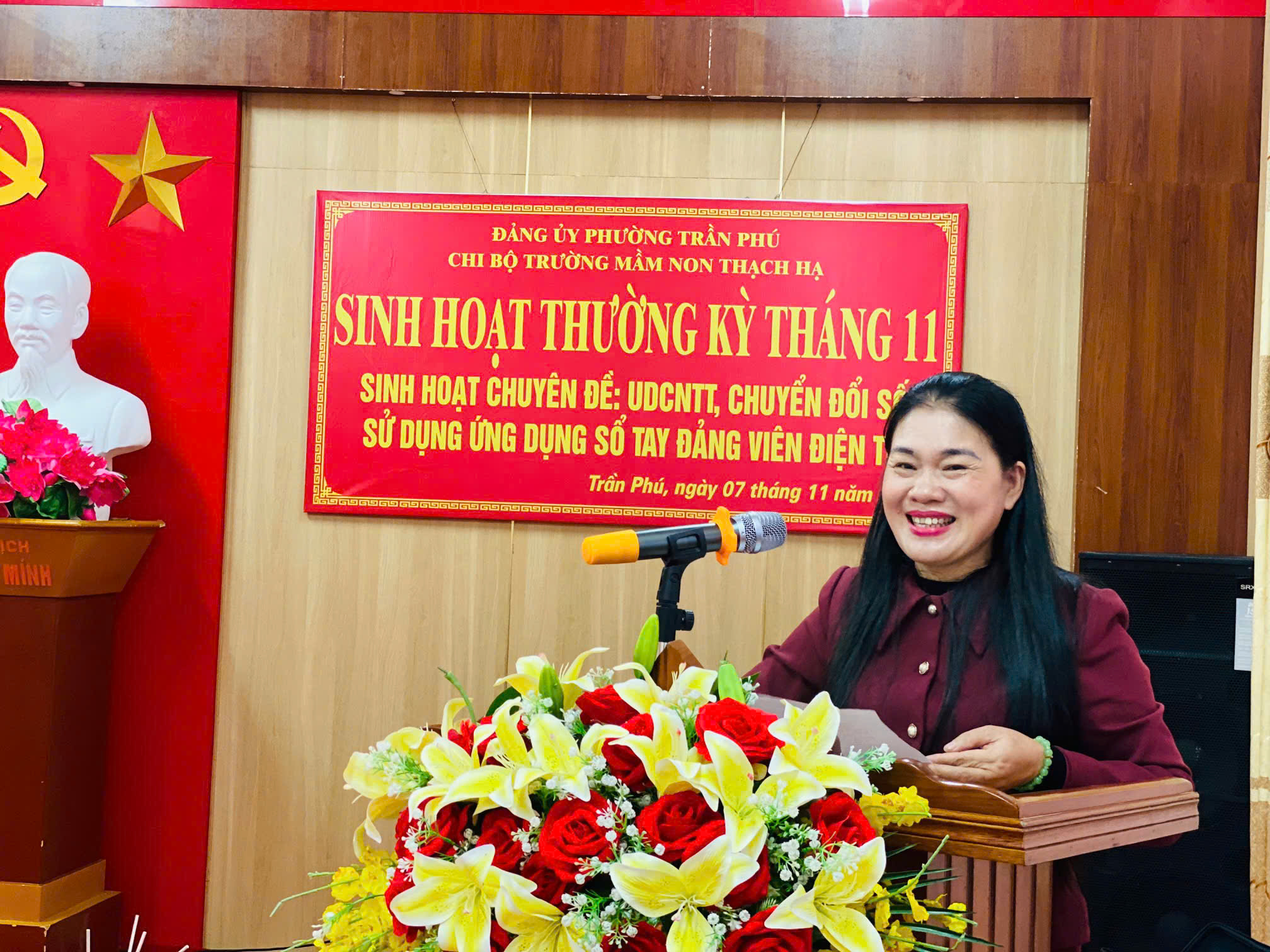 Phát biểu kết luận buổi sinh hoạt, Bí thư Chi bộ Trường Mầm non Thạch Hạ khẳng định: việc ứng dụng công nghệ thông tin, chuyển đổi số và sử dụng Sổ tay đảng viên điện tử là bước đi cụ thể, thiết thực nhằm đổi mới phương thức lãnh đạo, quản lý, góp phần nâng cao hiệu quả sinh hoạt chi bộ và công tác chuyên môn của nhà trường. Chi bộ sẽ tiếp tục tăng cường công tác tuyên truyền, bồi dưỡng kỹ năng số cho cán bộ, đảng viên; duy trì sinh hoạt chuyên đề về chuyển đổi số định kỳ, từng bước xây dựng đội ngũ đảng viên có năng lực số, đáp ứng yêu cầu trong giai đoạn mới.