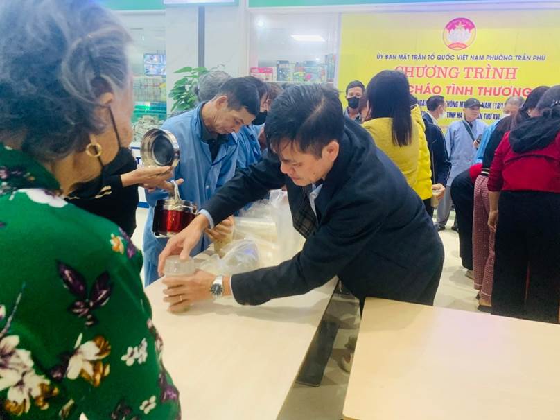 Cán bộ, công chức Ủy ban Mặt trận Tổ quốc phường tham gia phát cháo cho bệnh nhân