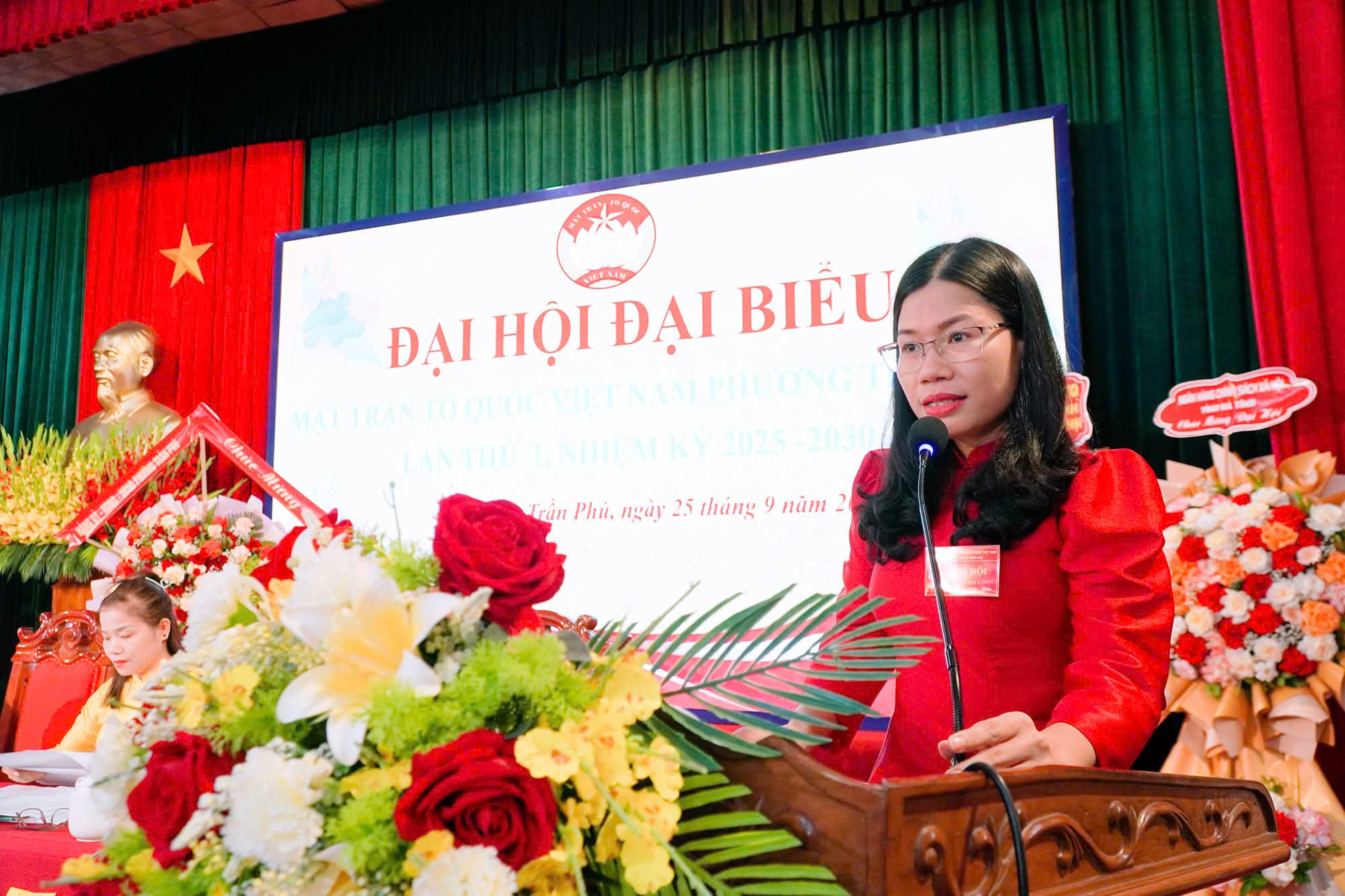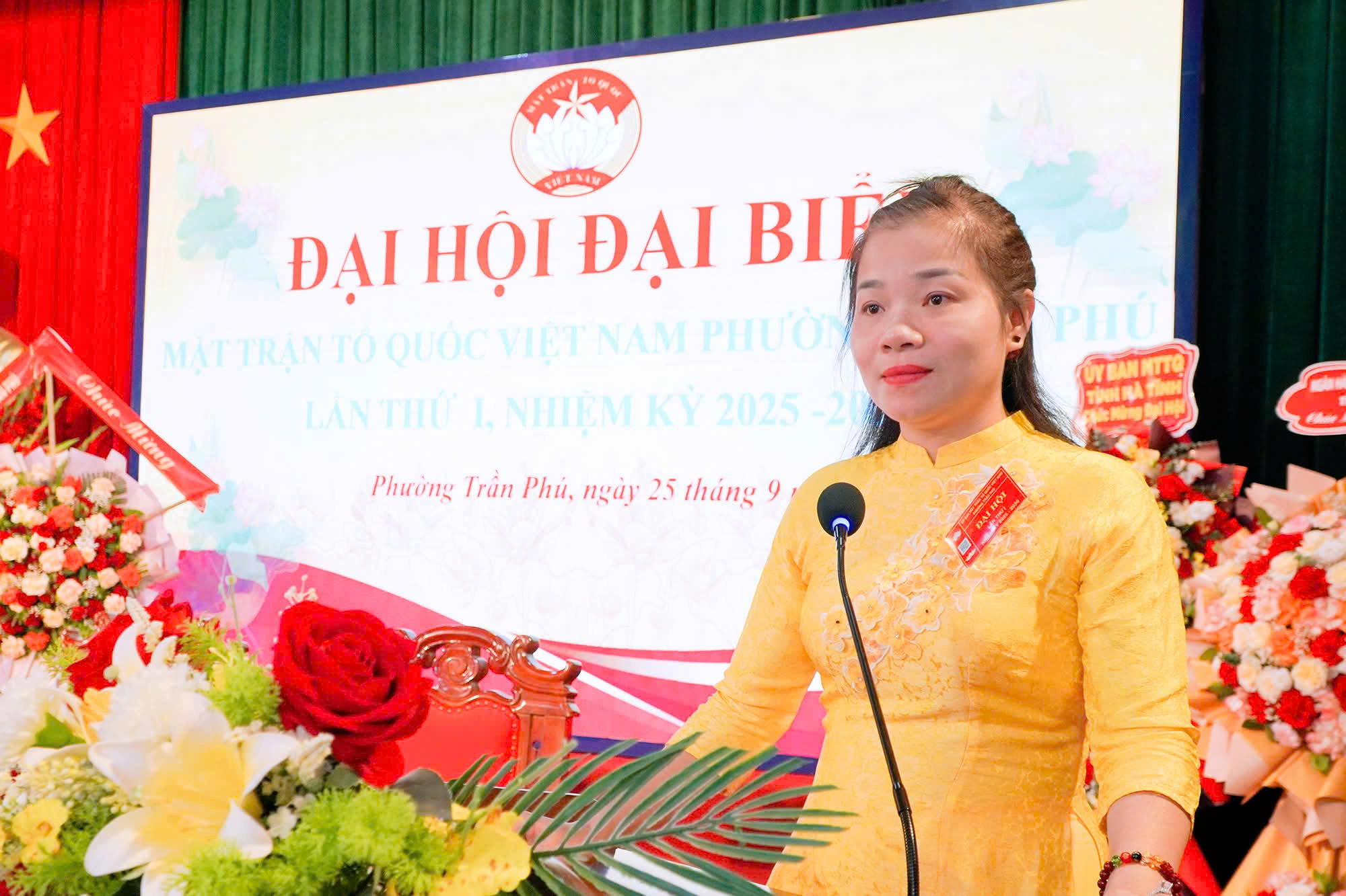 Tại phiên làm việc thứ nhất, Đại hội đã hiệp thương cử 61 ông, bà là Ủy viên UBMTTQ phường Trần Phú khóa I, nhiệm kỳ 2025 - 2030; 3 đại biểu chính thức dự Đại hội đại biểu MTTQ Việt Nam tỉnh Hà Tĩnh nhiệm kỳ 2025 - 2030; hiệp thương cử ông Trương Bá Khanh giữ chức Chủ tịch UBMTTQ phường và 4 ông, bà giữ chức Phó Chủ tịch UBMTTQ Việt Nam phường Trần Phú khóa I, nhiệm kỳ 2025 - 2030.