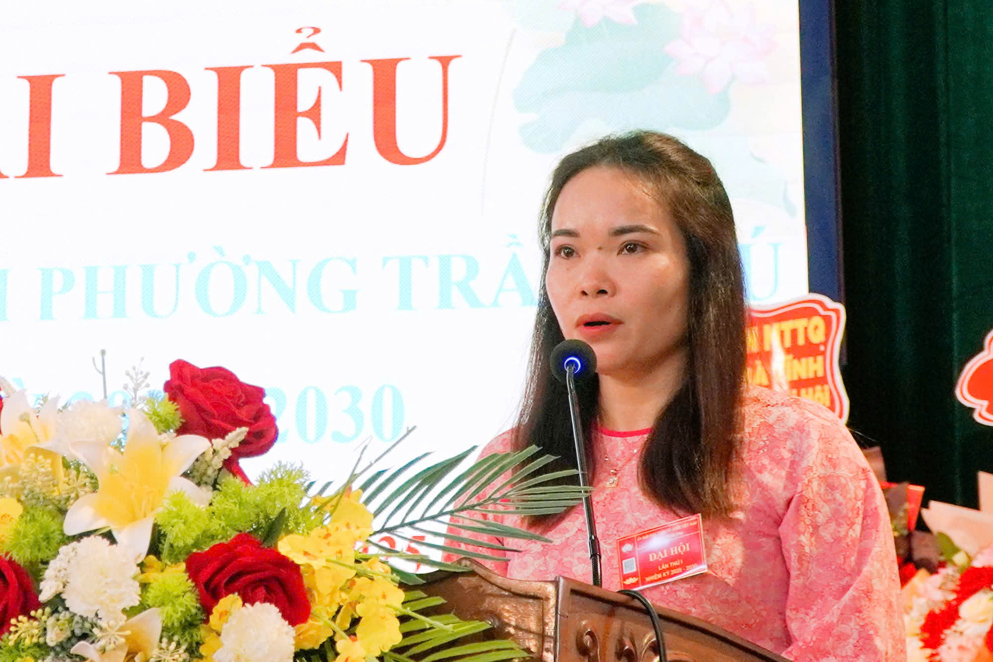 Đồng chí Võ Thị Hoa, Phó Chủ tịch UBMTTQ, Chủ tịch Hội LHPN phường trình bày báo cáo tại Đại hội