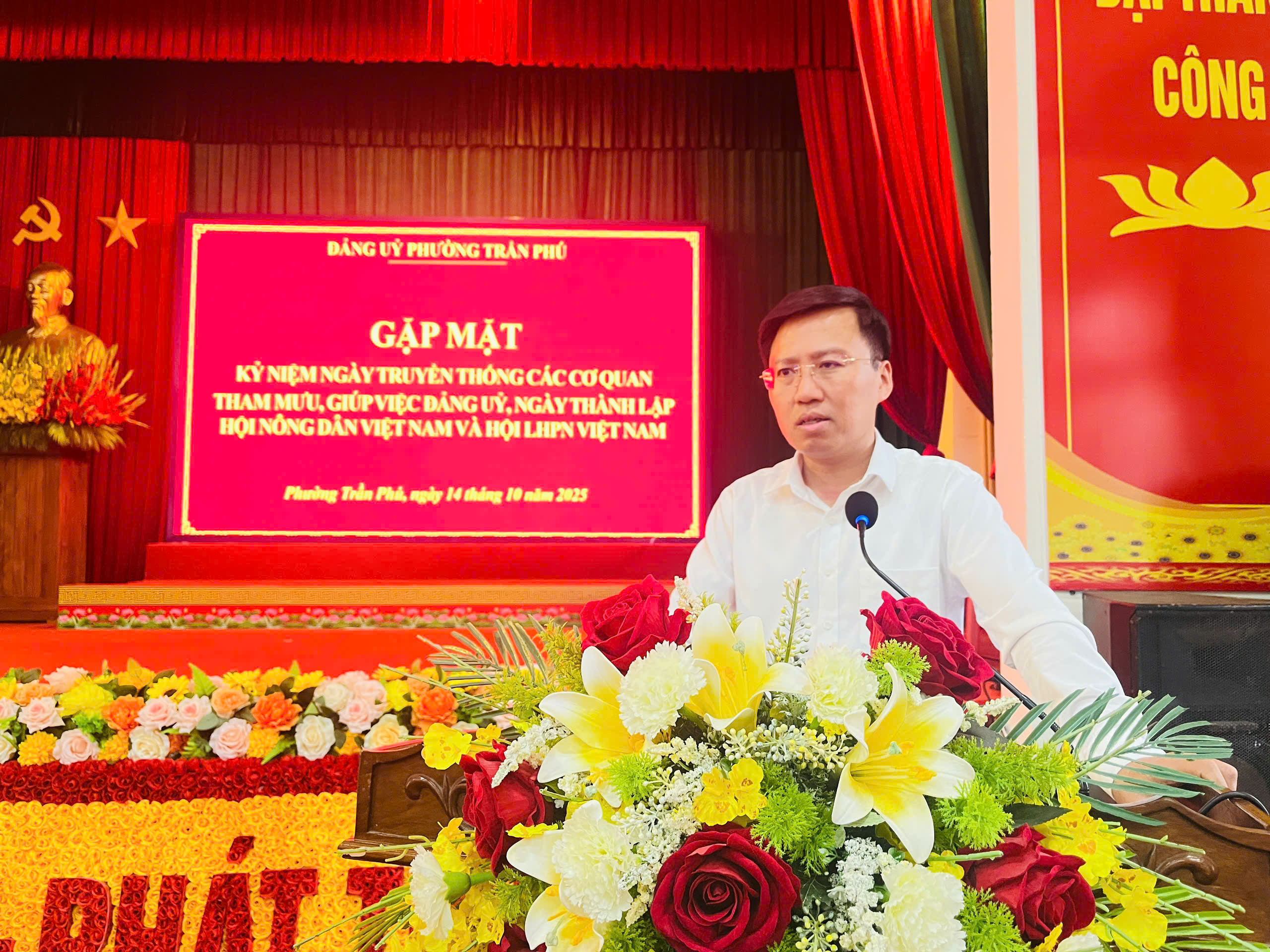 Trong không khí phấn khởi của buổi gặp mặt, Bí thư Đảng ủy-Chủ tịch HĐND phường Phạm Hùng Cường chúc mừng, ghi nhận, đánh giá cao những cố gắng, nỗ lực của tập thể cán bộ, công chức Ban Xây dựng Đảng, các cơ quan giúp việc cùng Hội Nông dân và Hội LHPN phường trong thời gian qua. Đặc biệt là thời kỳ thực hiện chính quyền địa phương 2 cấp, phường Trần Phú có quy mô lớn, áp lực công việc, nhưng các cơ quan tham mưu đã nỗ lực, phát huy tinh thần trách nhiệm hoàn thành xuất sắc nhiệm vụ được giao.