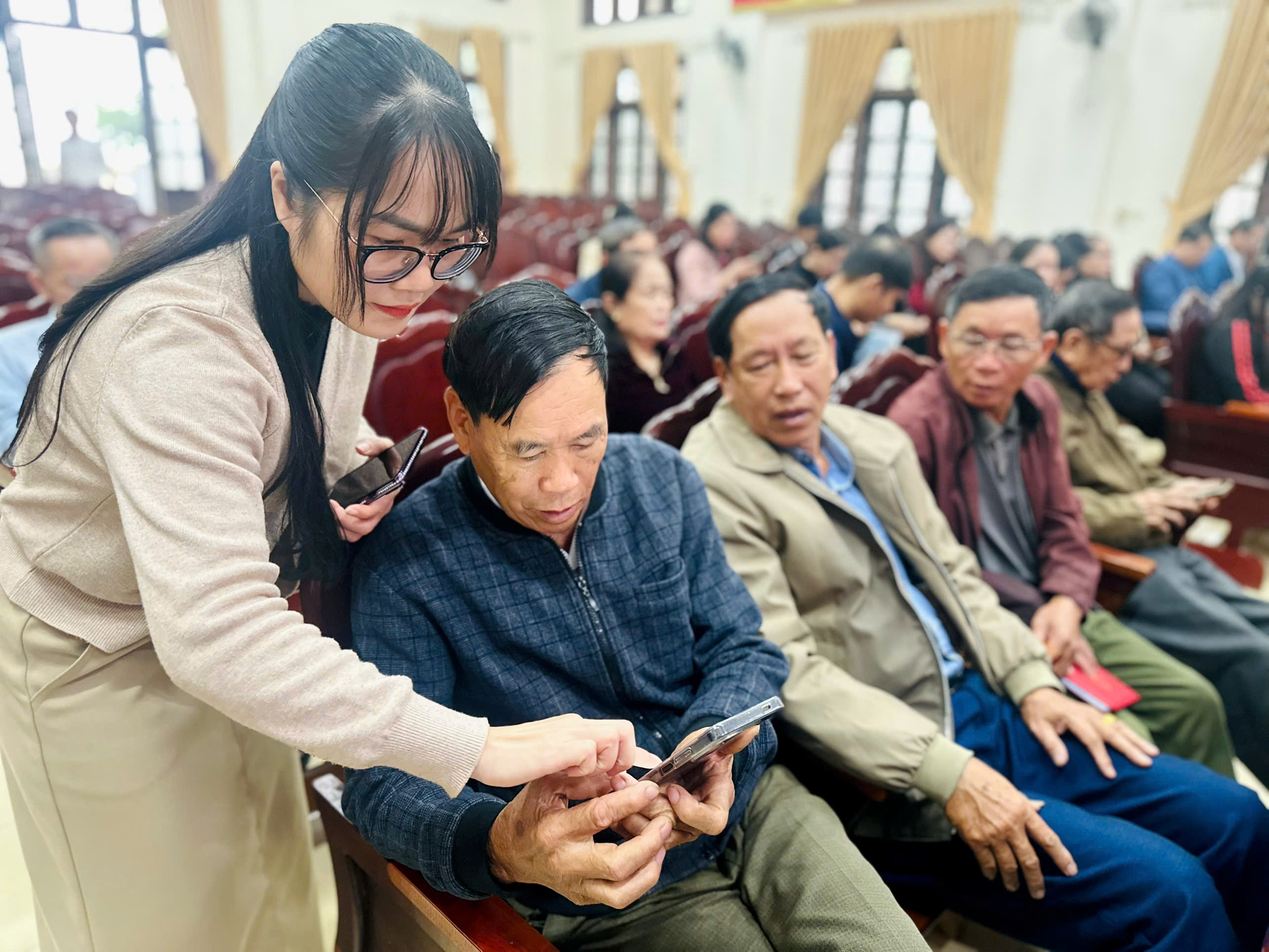 Cán bộ Văn phòng Đảng ủy hướng dẫn đại biểu điểm danh và cài đặt ứng dụng ICPV Book trên điện thoại di động