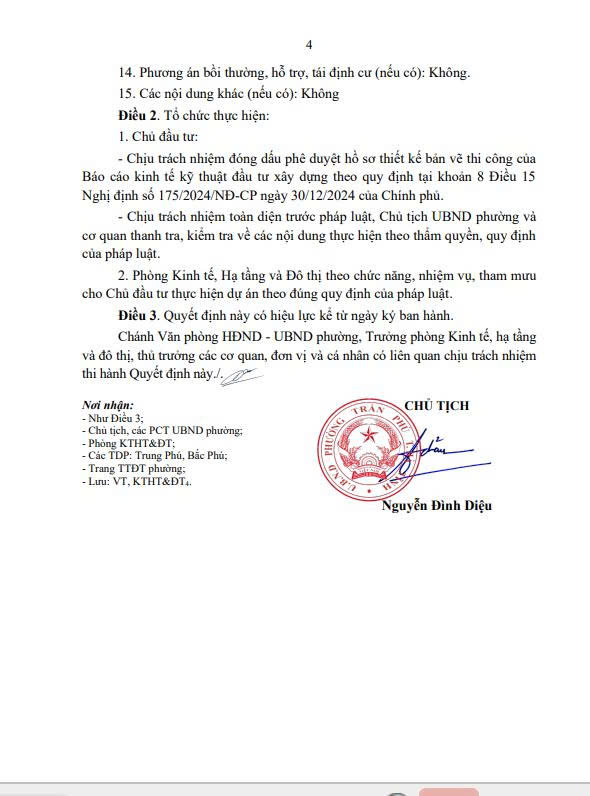 Quyết định số 543/QĐ-UBND ngày 14/11/2025 về việc phê duyệt Báo cáo kinh tế - kỹ thuật đầu tư xây dựng công trình Mương tiêu thoát nước đoạn tổ dân phố Trung Phú và Bắc Phú, phường Trần Phú