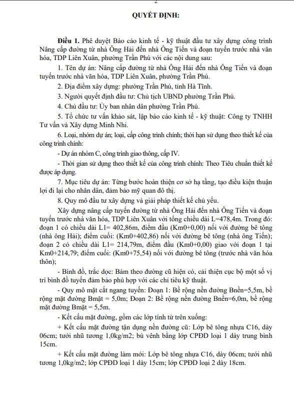 Đầu tư xây dựng công trình Nâng cấp đường từ nhà Ông Hải đến nhà Ông Tiến và đoạn tuyến trước nhà văn hóa, TDP Liên Xuân, phường Trần Phú