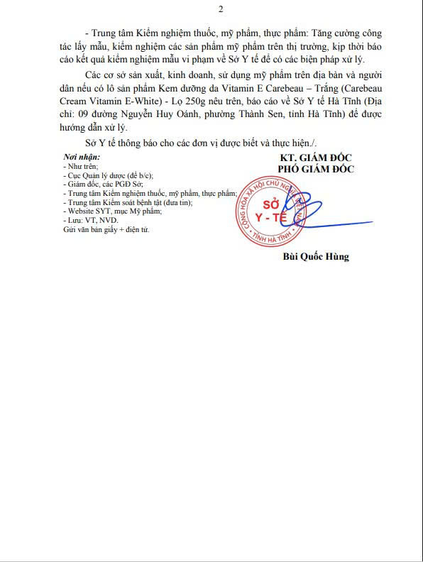 Đình chỉ lưu hành, thu hồi trên toàn quốc lô sản phẩm Kem dưỡng da Vitamin E Carebeau – Trắng (Carebeau Cream Vitamin E-White) – Lọ 250g. Trên nhãn ghi: Số tiếp nhận Phiếu công bố: 135014/20/CBMP-QLD; Số lô: 561; NSX: 08/2024; HSD: 08/2027; Tổ chức chịu trách nhiệm đưa sản phẩm ra thị trường: Công ty TNHH đầu tư thương mại và dịch vụ Thương