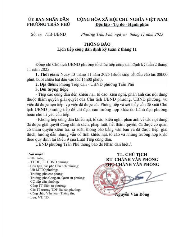 Thông báo lịch tiếp công dân định kỳ tuần 2 tháng 11 của Chủ tịch UBND phường Trần PhúNguyễn Thị Lam, Chuyên viên phòng VH-XH07/11/2025A -A+Nguyễn Thị Lam, Chuyên viên phòng VH-XH07/11/2025A -A+Lịch tiếp công dân định kỳ tuần 2 tháng 11 của Chủ tịch UBND phường Trần Phú