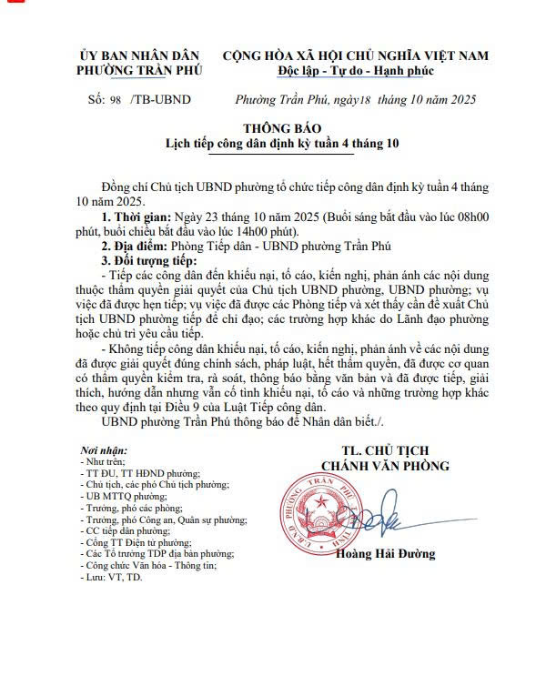 Thông báo lịch tiếp công dân định kỳ tuần 4 tháng 10 của Chủ tịch UBND phường Trần PhúNguyễn Thị Lam, Chuyên viên phòng VH-XH18/10/2025A -A+Nguyễn Thị Lam, Chuyên viên phòng VH-XH18/10/2025A -A+Lịch tiếp công dân định kỳ tuần 4 tháng 10 của Chủ tịch UBND phường Trần Phú vào ngày thứ 5 (23/10/2025)
