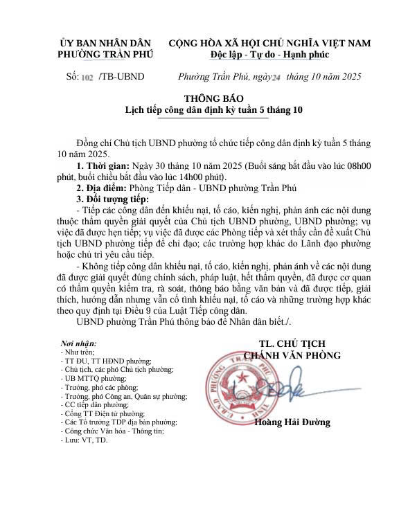 Thông báo lịch tiếp công dân định kỳ tuần5 tháng 10 của Chủ tịch UBND phường Trần PhúNguyễn Thị Lam, Chuyên viên phòng VH-XH24/10/2025A -A+Nguyễn Thị Lam, Chuyên viên phòng VH-XH24/10/2025A -A+Lịch tiếp công dân định kỳ tuần 4 tháng 10 của Chủ tịch UBND phường Trần Phú vào ngày 30/10/2025 (thứ 5)