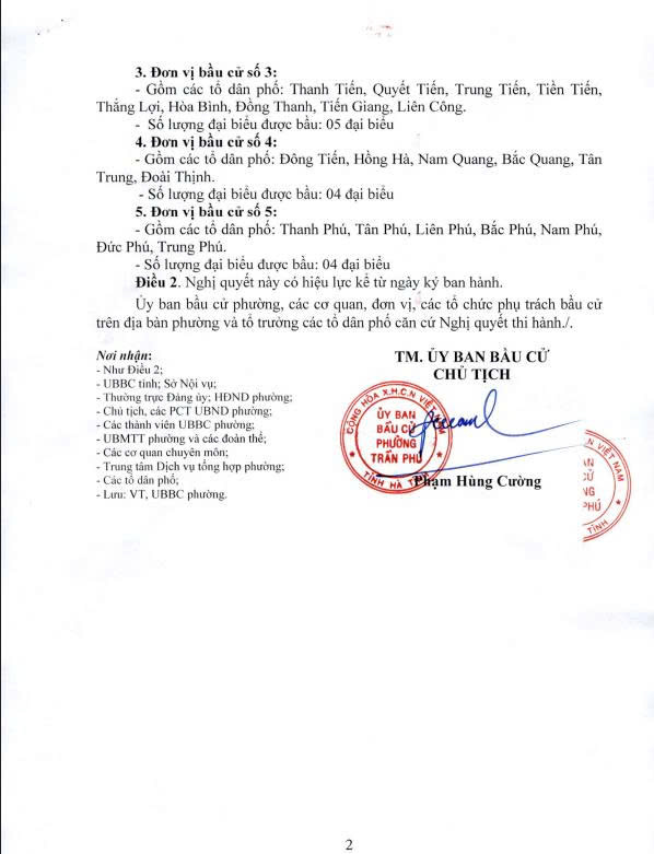 Ủy ban bầu cử phường Trần Phú ban hành Nghị quyết số 05/NQ - UBBC NGÀY 22/12/2025 về ấn định số đơn vị bầu cử, danh sách các đơn vị bầu cử, số lượng Đại biểu được bầu ở mỗi đơn vị bầu cử đại biểu HĐND phường nhiệm kỳ 2026 - 2031.