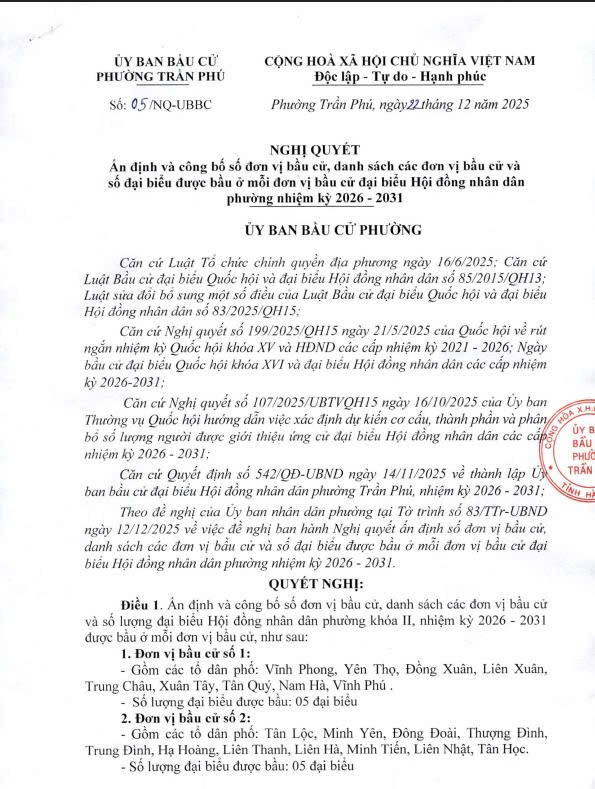 ỦY BAN BẦU CỬ PHƯỜNG TRẦN PHÚ BAN HÀNH NGHỊ QUYẾT SỐ 05/NQ-UBBC NGÀY 22/12/2025