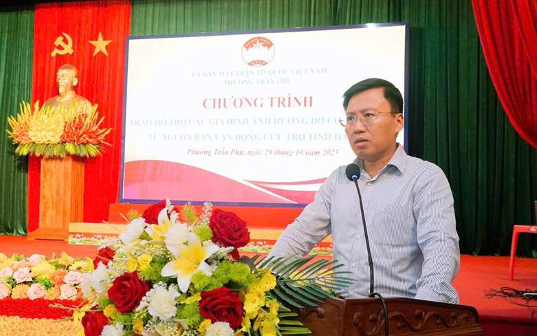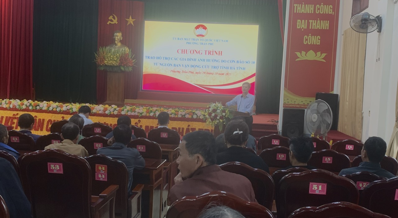 Chiều ngày 29/10/2025, Ủy ban Mặt trận Tổ quốc Việt Nam phường Trần Phú đã tổ chức trao 500 triệu đồng hỗ trợ cho các hộ dân bị thiệt hại do bão số 10 trên địa bàn phường từ nguồn Quỹ cứu trợ tỉnh Hà Tĩnh